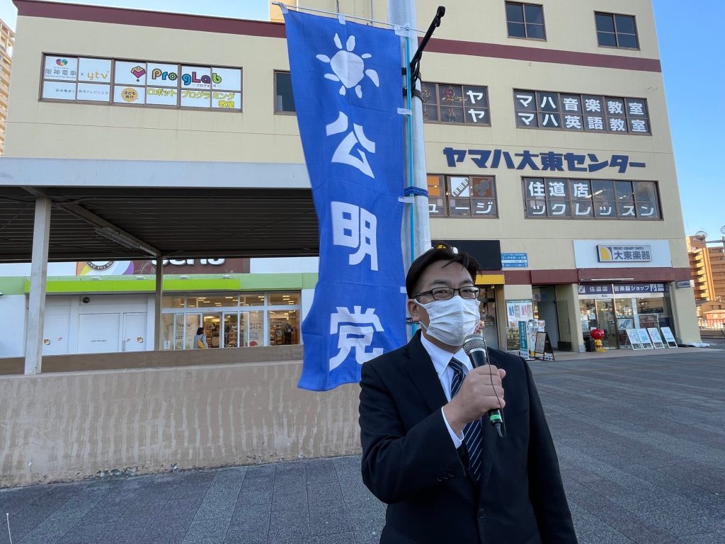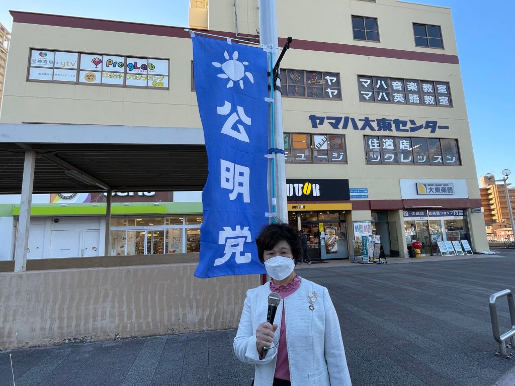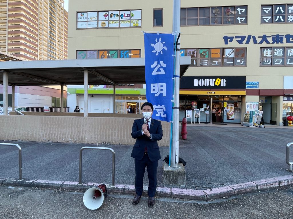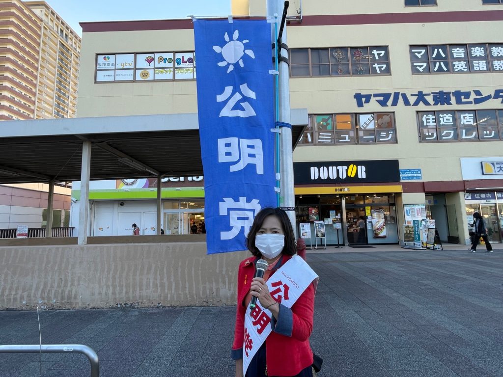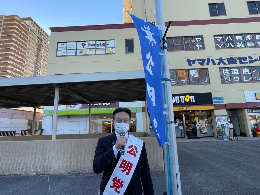 本日、大東市公明党議員団は、住道駅北側デッキにて、うつみ府議とともに街頭演説を行いました。先の衆議院選挙に掲げた公明党の公約である『子育て・教育』、『経済再生』、『感染症対策』などの政策について申し上げました。必ずや実現してまいります。