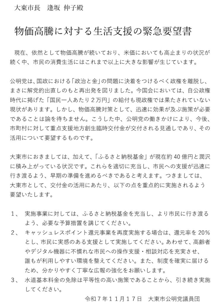 昨日の11月17日、公明党の結党記念日に、大東市公明党議員団として、逢坂市長へ
