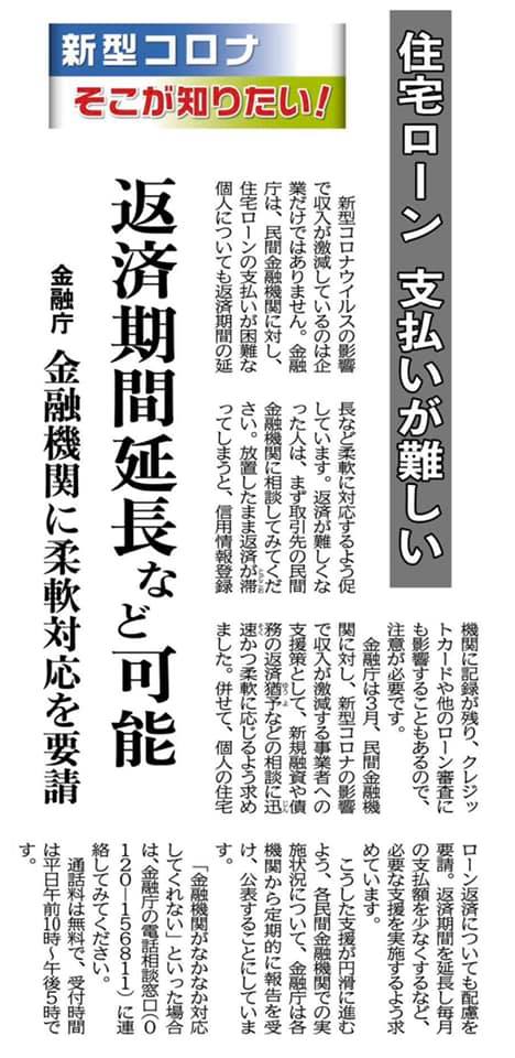 昨日は、住道駅前末広公園で、若いお母さん方とお話しをさせていただきました。学校の休校が長期化し、保護者負担が増しています。大東市では、1年生から3年生の放課後児童クラブへ在籍していない子どもの教室受け入れを行なっていますが、全学年を対象にするべきではないか等のご意見もありました。先頃市議会で議決したコロナウィルス対策予算も必要な箇所へ早急に執行していく事が重要です。様々な状況が目まぐるしく変化しています。医療機関での感染拡大を防ぐオンライン診療を緩和させる記事が本日付けの公明新聞に掲載されています。院内感染を防止するためにも初診からオンライン診療の推進が必要です。また、今回の影響で、住宅ローンなど返済が滞る場合、期間延長などの措置をすぐさま行うべきです。事業所への緊急融資も、実績が無いとの事で、希望額に全く達しない額の提示しかされないなど貸し渋りととも思える事態も相談がありました。支給する側にも理解が必要です。