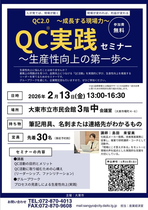 大東市では、市内企業とともに現場改善を支援する「QC2.0~成長する現場力~」を提案・実現し、地域の底力を引き出す取り組みを進めています。また、防災士としての知見を生かし、防災システムのデジタル化や「大東市防災アプリ」の導入にも実現いたしました。