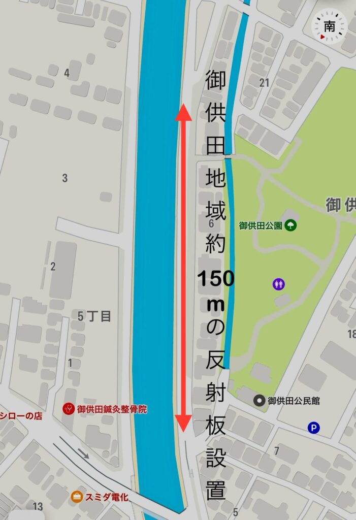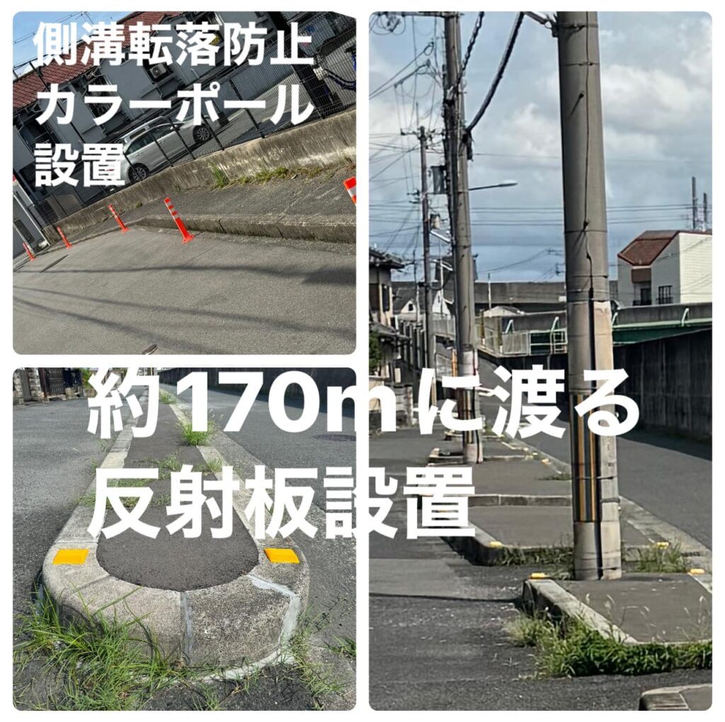 御供田地域ブロックフロートへの反射板設置については、夜間に自転車がブロック段差に気が付かずに転倒された方の相談から道路課と相談し約170mにわたり10数箇所に設置されました。