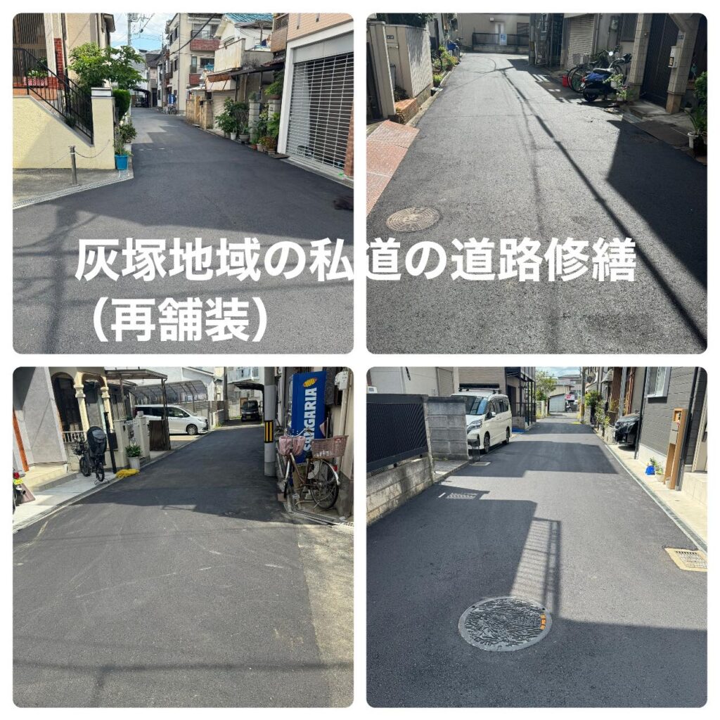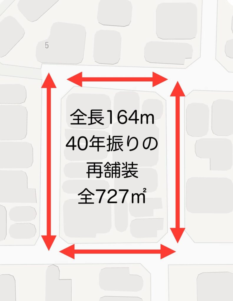 灰塚地域の私道で、道路修繕要望書を作成させて頂くのに大変時間を用しました。地域を四角に囲む形で全長164m、全727㎡の舗装となりました。