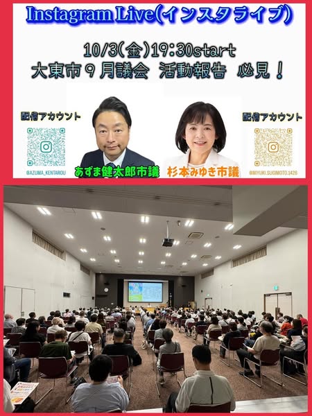 10月3日、9月議会の取り組みを東議員とトークライブ形式でさせて頂きます。