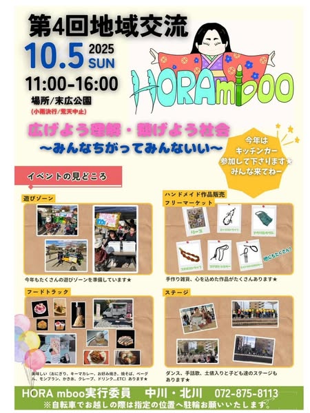 本日、住道駅南側の末広公園にて行われましたHORA mboo主催の「第4回地域交流」に伺いました。
