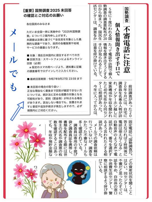 現在、国勢調査が始まっていますが、それに便乗する詐…