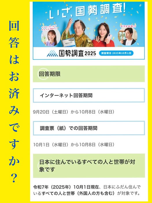 国勢調査はお済みですか?今日が最終日ですので、まだ…